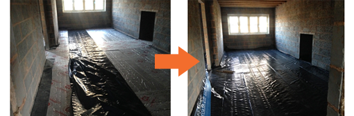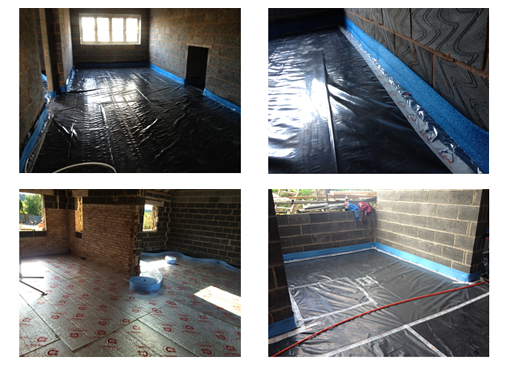 If using liquid screed, a membrane of between 500 and 1000 gauge must be laid as crease/fold free as possible, with all joints taped and no gaps. The membrane should lap up the wall by approx 100mm with the corners folded/cut/taped neatly. This step is essential in underfloor heating floor preparation, as it helps to protect against unwanted moisture, meaning your system is more durable and long-lasting. See pictures below.