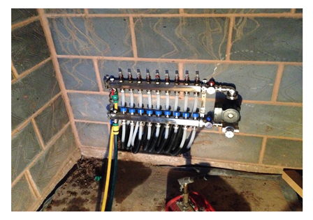 If the pipe is to be routed through walls, there should be a suitably sized hole(s) for this with conduit around the pipe to protect it. You can use expanding foam or similar to fill in afterwards. This is an important step when preparing your floor for underfloor heating, as it helps to prevent damage to the pipe and reduces heat loss. See the picture below.