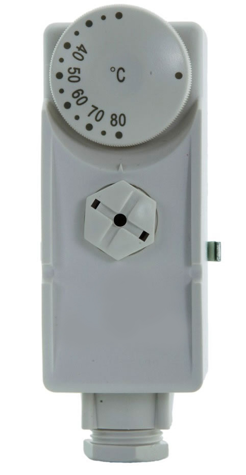 It is fixed to the flow rail of the underfloor heating1 manifold and adjusted to interrupt the power to the pump providing effective high temperature safety control.
