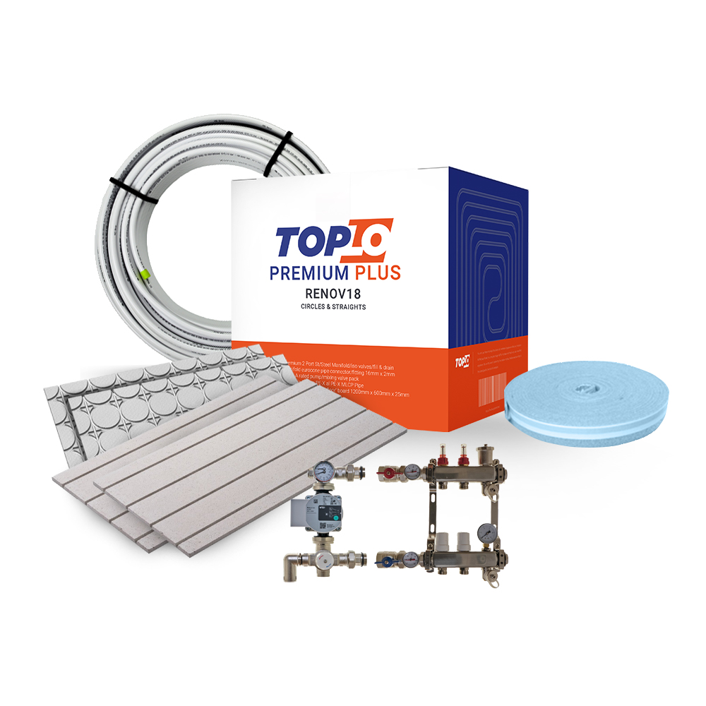 18mm Fermacell Gypsum Fibre boards for the ultimate low profile system. The boards/compound warm up creating thermal mass. System uses 12mm pipe at 150mm spacing. Produces up to (125W/m²) output.